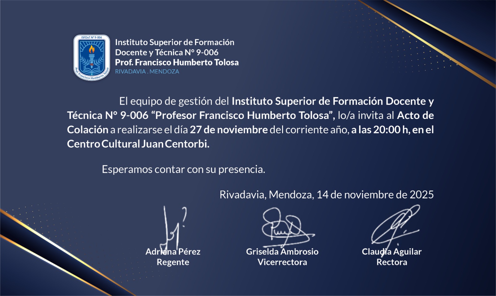 El equipo de gestión del Instituto Superior de Formación Docente y Técnica N.º 9-006 “Profesor Francisco Humberto Tolosa” invita a toda la comunidad educativa a participar del Acto de Colación 2025, que se llevará a cabo el 27 de noviembre, a las 20:00 h, en el Centro Cultural Juan Centorbi, en Rivadavia. Este encuentro constituye … [+]