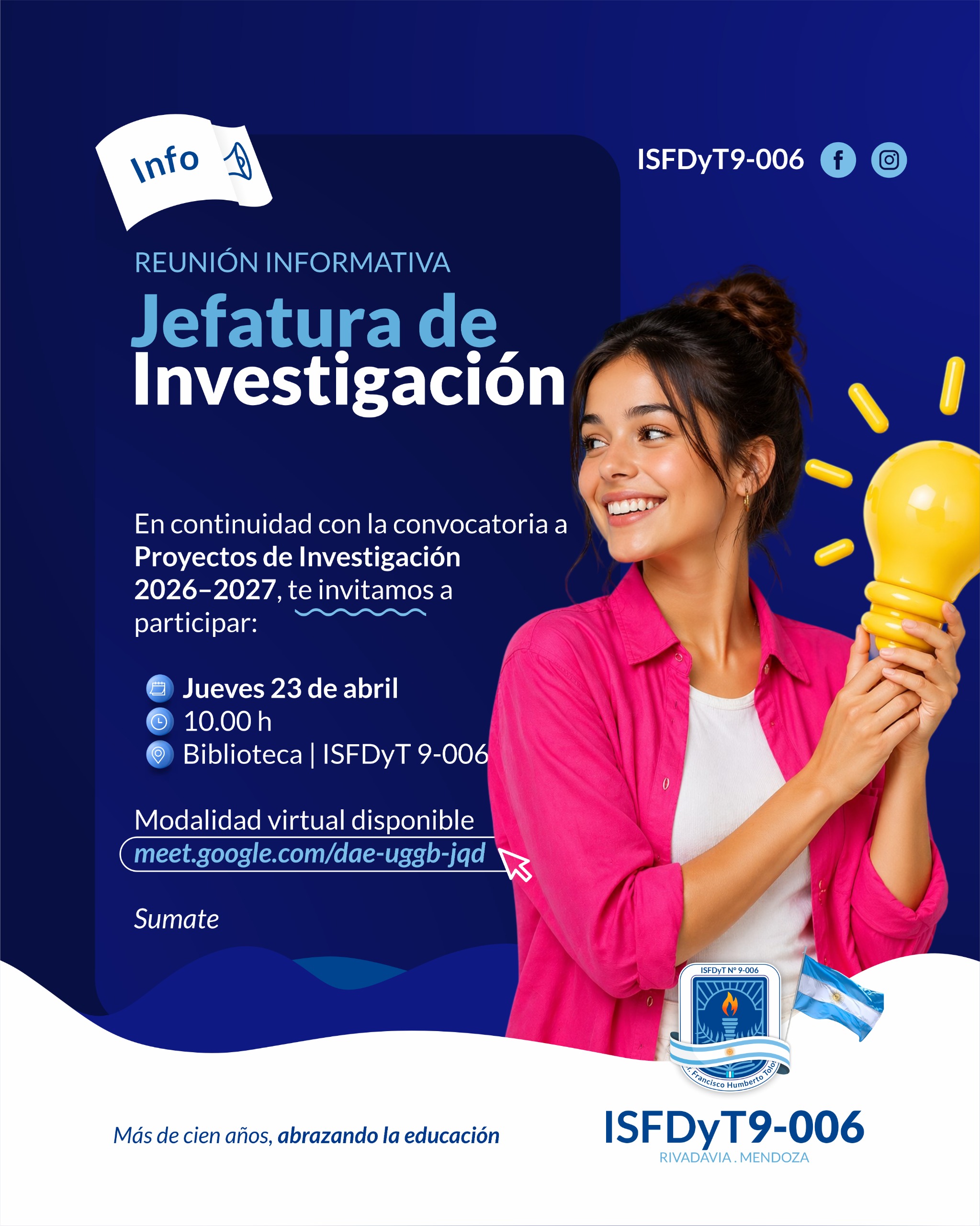 La Jefatura de Investigación del ISFDyT N.º 9-006 invita a toda la comunidad educativa a participar de una reunión informativa en el marco de la convocatoria a Proyectos de Investigación 2026–2027. El encuentro se realizará el próximo jueves 23 de abril a las 10:00 horas, en la Biblioteca de la institución, y tiene como propósito … [+]